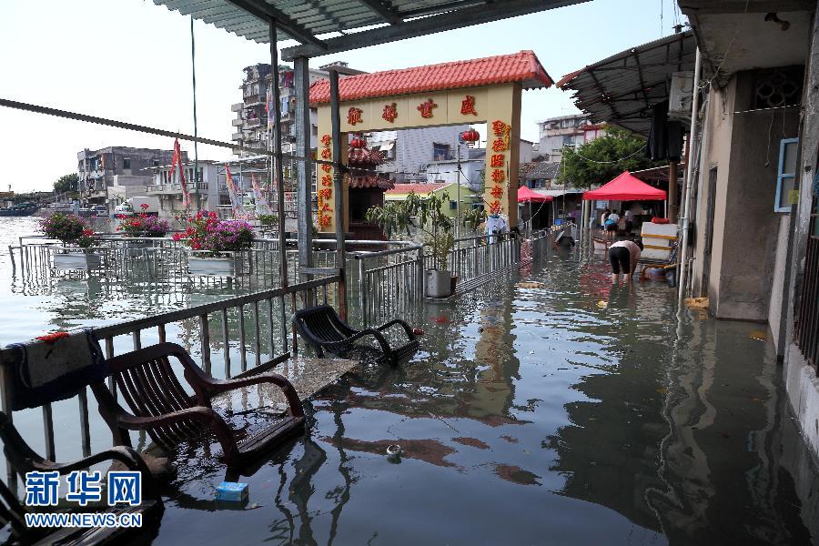 10月10日,在厦门沙坡尾避风坞,海水淹没到居民家门槛。 10月9日起,受天文大潮、冷空气和超强台风“黄蜂”外围叠加影响,厦门最高潮水位较去年同期大幅增高,厦门鹭江道升平路、海湾公园、沙坡尾、厦大白城以及鼓浪屿钢琴码头等多处出现海水倒灌。新华社发(田晓 摄)