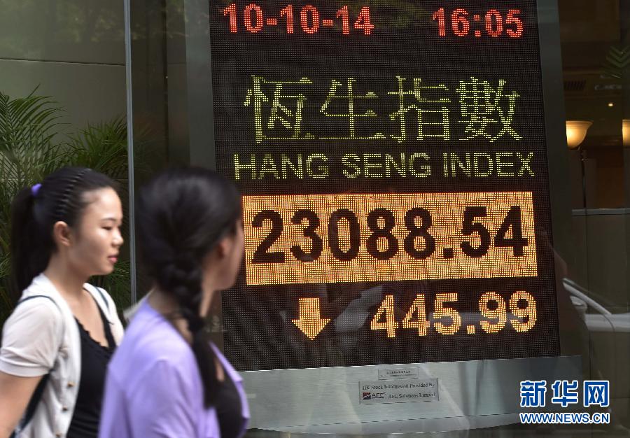 10月10日,路人从香港湾仔一家银行的恒生指数电子显示屏前走过。 当日,香港恒生指数下跌445.99点,收报23088.54点。新华社记者 吕小炜 摄