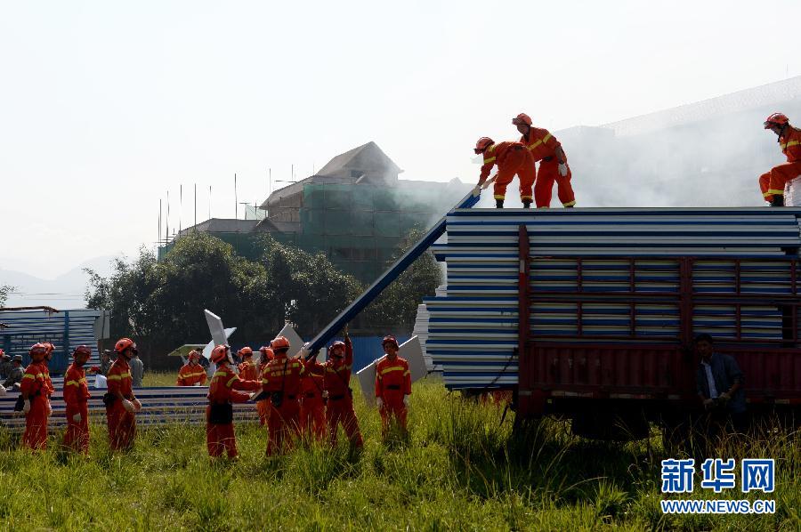 10月10日,部队官兵在永平镇第一小学的足球场搬卸板房设施。当日,由云南青少年发展基金会捐助的首批板房学校设施运抵位于云南景谷地震重灾区的永平镇第一小学。据介绍,首批板房学校设施主要包括搭建24间板房教室所需的设备。新华社记者 胡超 摄