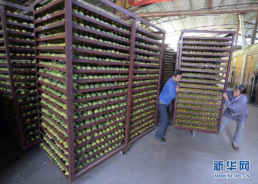 10月9日,在广西龙胜各族自治县,罗汉果加工厂工人准备将罗汉果推入烤房烘干。广西龙胜各族自治县通过“公司+合作社+农户”的方式大力发展罗汉果种植产业,目前,该县罗汉果种植面积已有1万多亩,年产值超过1亿元。新华社发(韦吉阳 摄)