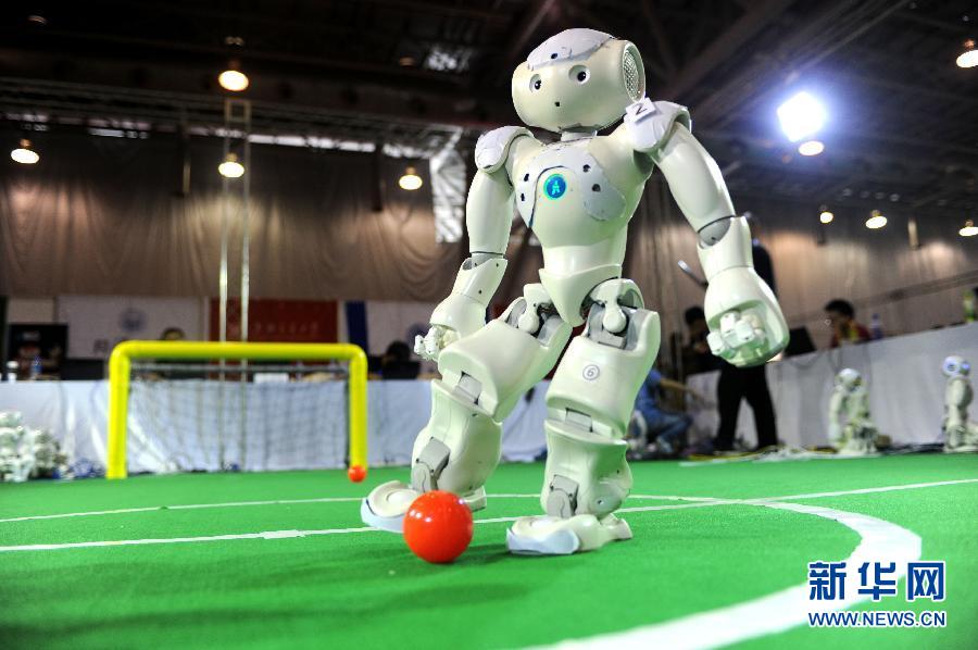 10月10日,一台机器人在足球比赛前进行测试。当日,为期3天的2014中国机器人大赛在安徽合肥正式开赛。来自南京大学、清华大学等国内众多高校的2000余名选手将在足球机器人、救援机器人、家庭机器人等多个项目上进行比赛和展示。新华社记者 刘军喜 摄