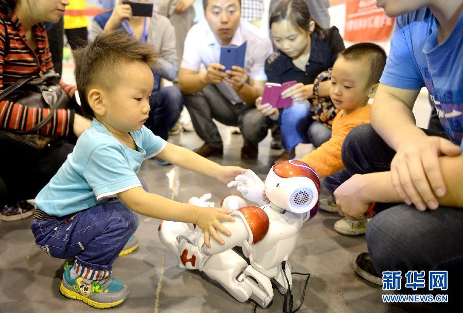 10月10日,两位小朋友在与一个家庭机器人互动。当日,为期3天的2014中国机器人大赛在安徽合肥正式开赛。来自南京大学、清华大学等国内众多高校的2000余名选手将在足球机器人、救援机器人、家庭机器人等多个项目上进行比赛和展示。新华社记者 郭晨 摄