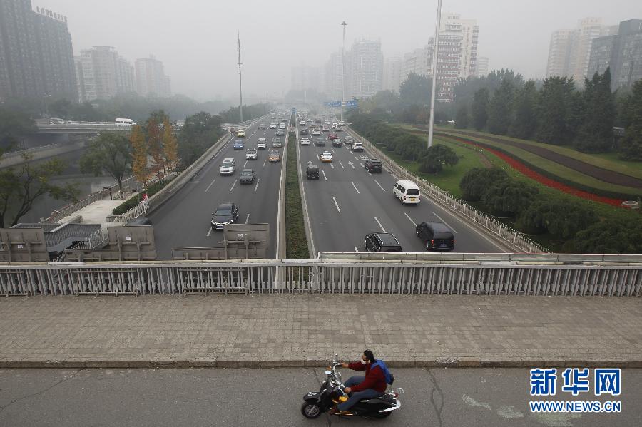 10月9日,北京城区笼罩在雾霾之中。当日,北京持续出现雾霾天气。北京市气象局9日10时45分更新发布霾橙色预警信号,预计9日下午到10日白天,北京地区空气污染气象条件非常不利于污染物的扩散,平原地区雾霾天气将持续。新华社记者 邢广利 摄