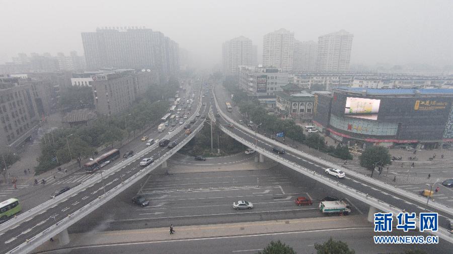 这是10月9日航拍的北京德胜门外大街。当日,北京持续出现雾霾天气。北京市气象局9日10时45分更新发布霾橙色预警信号,预计9日下午到10日白天,北京地区空气污染气象条件非常不利于污染物的扩散,平原地区雾霾天气将持续。新华社记者 邢广利 摄