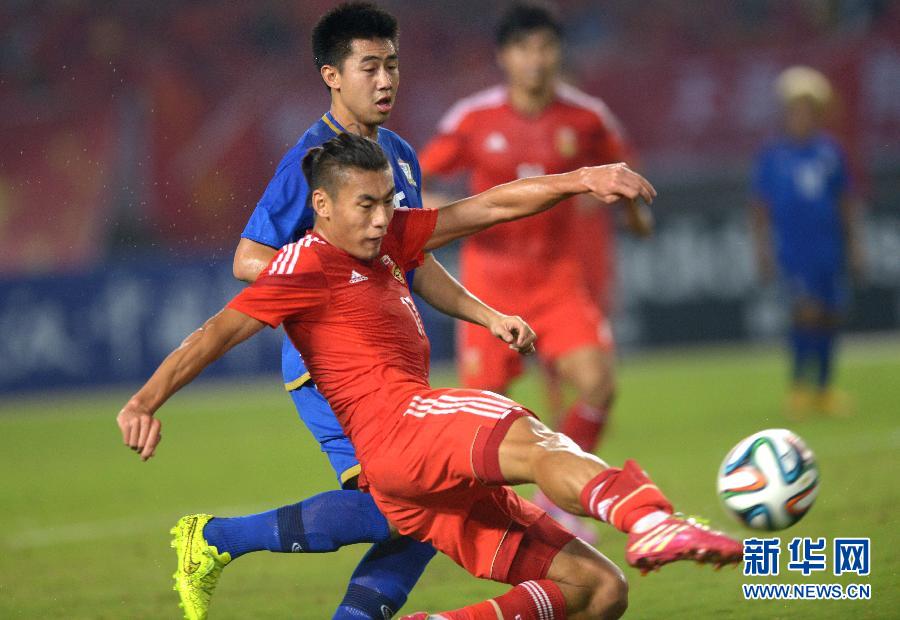 10月10日,中国队球员张呈栋(前)在比赛中射门。当日,在武汉体育中心体育场举行的国际足球友谊赛中,中国国家队以3比0战胜泰国国家队。新华社记者程敏摄