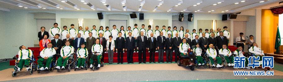 10月10日,澳门特区行政长官崔世安(第二排中)与代表团合影。当日,澳门特区行政长官崔世安向即将前往韩国仁川参加2014亚洲残疾人运动会的中国澳门运动员授予特区区旗。中国澳门体育代表团共派出45人,其中26名运动员将参加轮椅击剑、轮椅乒乓球、轮椅羽毛球等比赛项目。 新华社记者张金加摄