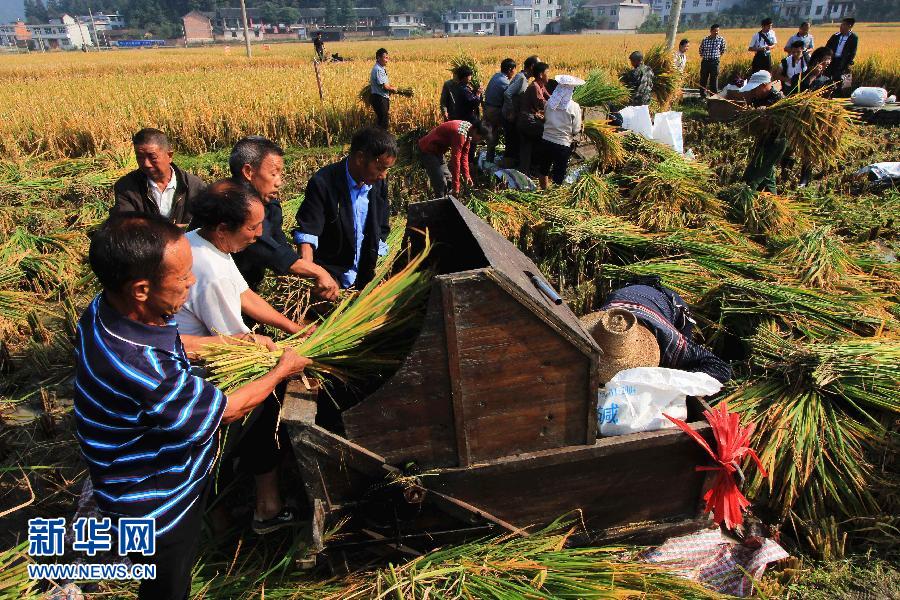10月10日,在湖南省溆浦县横板桥乡红星村,工作人员在给刚收割的稻谷进行脱粒。当日,农业部委派的专家组对湖南省溆浦县横板桥乡红星村的超级杂交稻进行了现场测产验收,通过随机抽样测得平均亩产1026.70公斤,这标志着袁隆平领衔的我国超级杂交稻第四期亩产千公斤攻关取得成功,也标志着我国杂交水稻育种技术再上新台阶,对我国粮食安全保障具有积极意义。新华社发(曾勇 摄)
