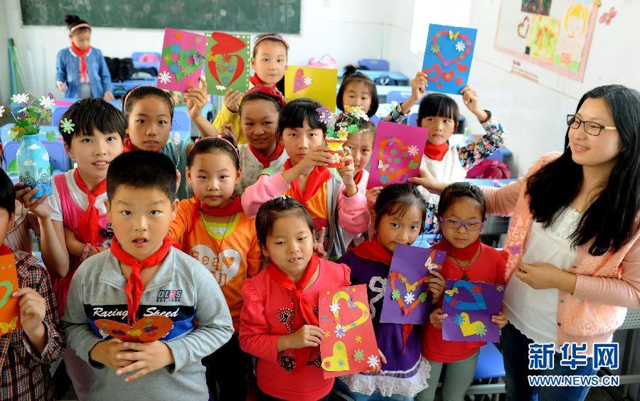 10月10日,“走教”老师商艳和义城小学的孩子们一起展示手工课的作业。新华社记者 刘军喜 摄