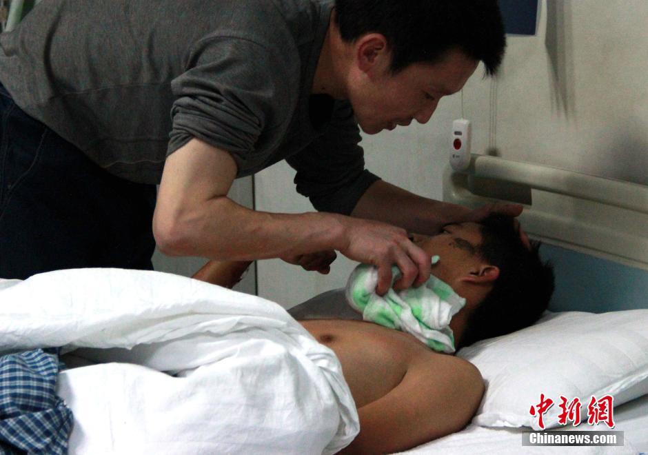 10日晚间发生于陕西甘泉境内一施工工地临时宿舍侧面山体滑塌事故,造成两排八间临时宿舍被冲垮,21人被埋。截至11日凌晨1时30分,确认19人遇难2人生还。中新社记者11日在医院对生者进行采访。。图为11日晚伤者在医院。张远 摄
