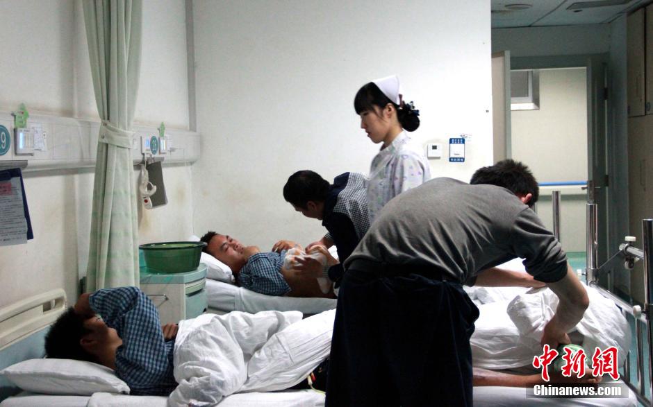 10日晚间发生于陕西甘泉境内一施工工地临时宿舍侧面山体滑塌事故,造成两排八间临时宿舍被冲垮,21人被埋。截至11日凌晨1时30分,确认19人遇难2人生还。中新社记者11日在医院对生者进行采访。。图为11日晚伤者在医院。张远 摄