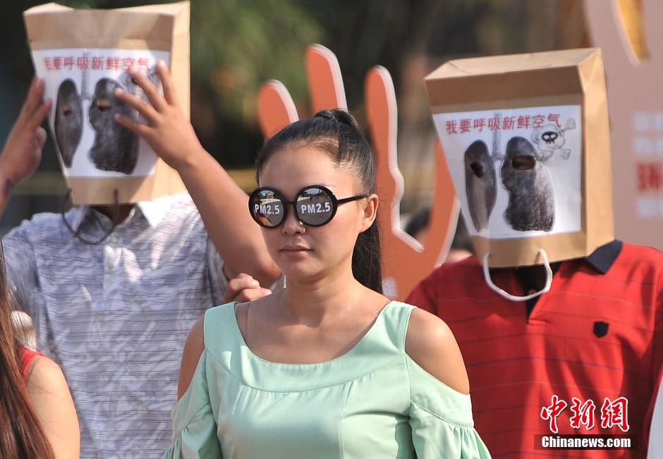 10月11日,重庆洋人街商铺工作人员戴着写有PM2.5的墨镜在景区宣传保护环境。10位商铺工作人员头戴写有“我要呼吸新鲜空气”的纸袋,举着“保护环境、强烈狙击PM2.5”、“我们要像保护家一样保护环境”、“保护环境让你拥有大自然的权利”等呼吁保护环境的标语,利用这种行为艺术的方式为游客宣传环境保护。陈超 摄