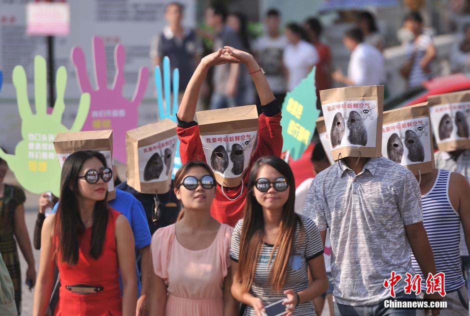 10月11日,重庆洋人街商铺工作人员戴着写有PM2.5的墨镜在景区宣传保护环境。10位商铺工作人员头戴写有“我要呼吸新鲜空气”的纸袋,举着“保护环境、强烈狙击PM2.5”、“我们要像保护家一样保护环境”、“保护环境让你拥有大自然的权利”等呼吁保护环境的标语,利用这种行为艺术的方式为游客宣传环境保护。陈超 摄