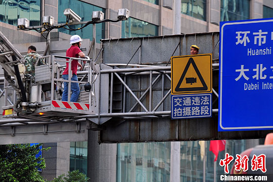 10月11日,广州一男子爬上环市东路的龙门架上,与警方对峙4小时,造成沿线交通严重堵塞。中新社发 陈骥旻 摄