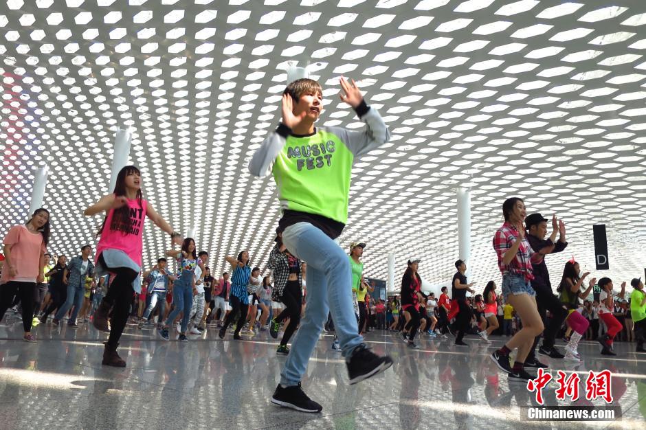10月12日,深圳机场航站楼上演了一场激情“快闪”秀,百余名来自社会各界的年轻“舞者”在候机大厅跳起欢快的街头热舞,吸引众多出行乘客的关注。据初步统计,深圳机场通航23年来累计运送旅客3.28亿人次,运送货邮超过900万吨。中新社发 陈文 摄