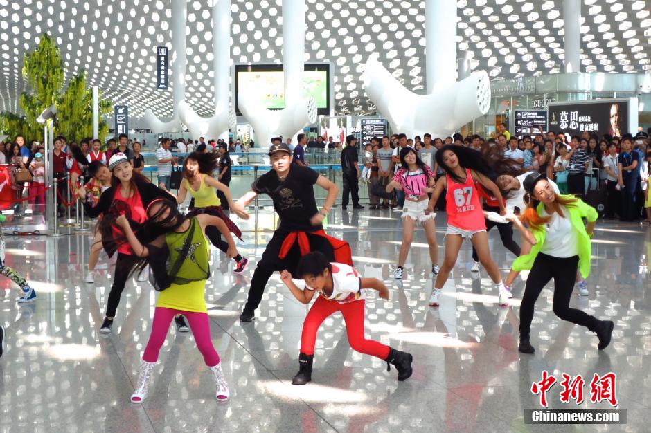 10月12日,深圳机场航站楼上演了一场激情“快闪”秀,百余名来自社会各界的年轻“舞者”在候机大厅跳起欢快的街头热舞,吸引众多出行乘客的关注。据初步统计,深圳机场通航23年来累计运送旅客3.28亿人次,运送货邮超过900万吨。中新社发 陈文 摄