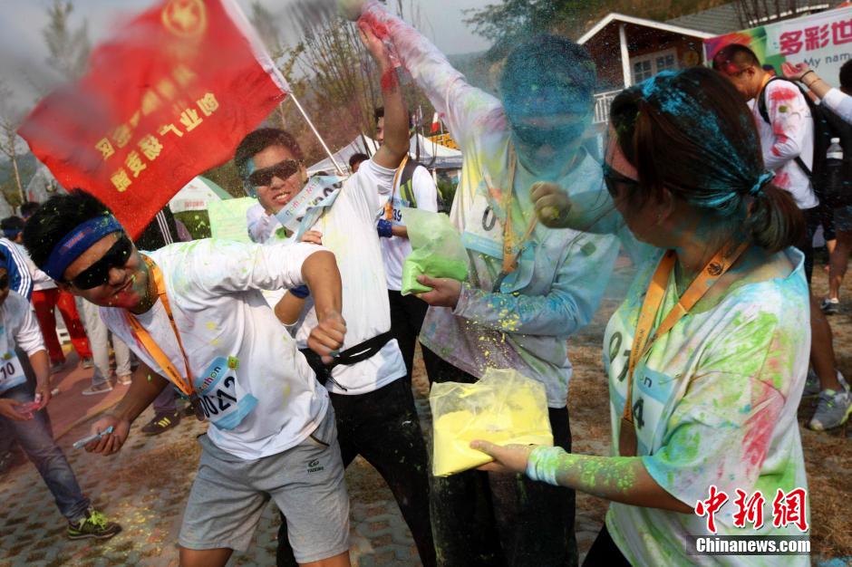10月12日上午,2014青岛世界园艺博览会,上千名运动员参加彩色短程马拉松比赛。比赛设有4公里、10公里两个赛程。比赛选手到达终点,相互挥撒彩色粉末,尽情享受狂欢之乐。中新社发 徐崇德 摄