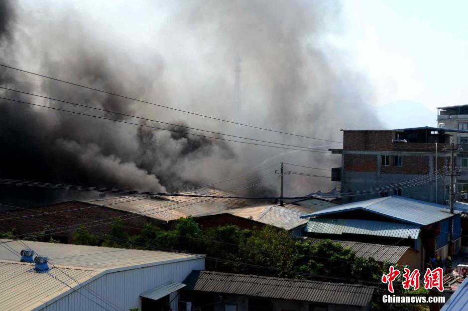10月12日,福建闽侯光明村一片紧挨着铁路和民居的厂房发生大火,由于厂房里生产的是床垫、油漆等物品,现场瞬间火光冲天。福州消防出动多辆消防车现场救援。目前,事故原因还在调查中。中新社发 王东明 摄