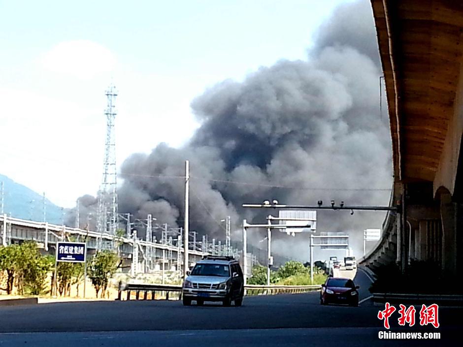10月12日,福建闽侯光明村一片紧挨着铁路和民居的厂房发生大火,由于厂房里生产的是床垫、油漆等物品,现场瞬间火光冲天。福州消防出动多辆消防车现场救援。目前,事故原因还在调查中。中新社发 王东明 摄