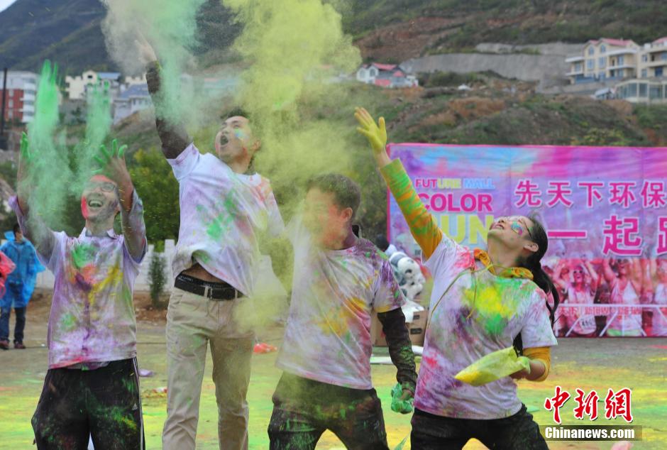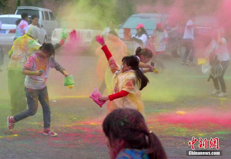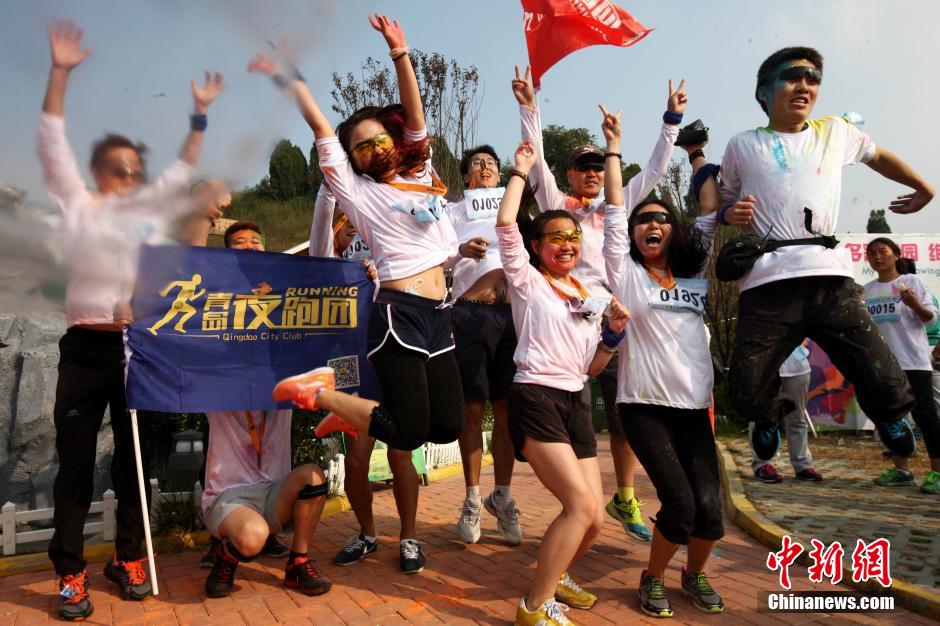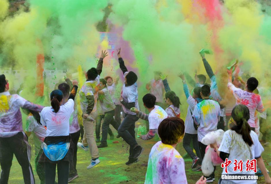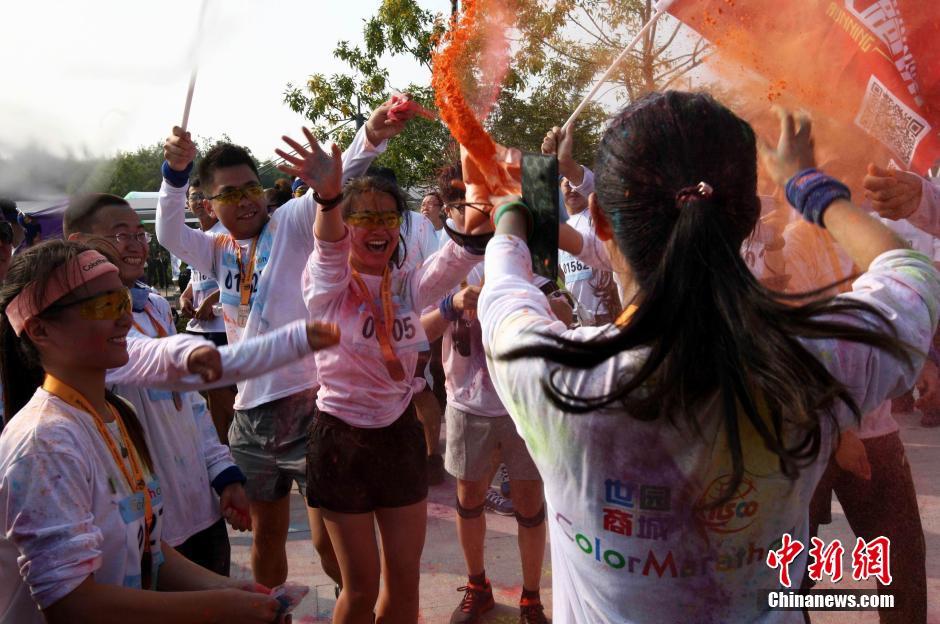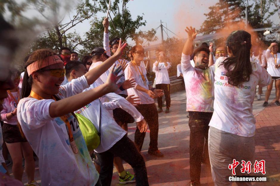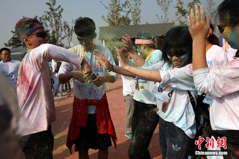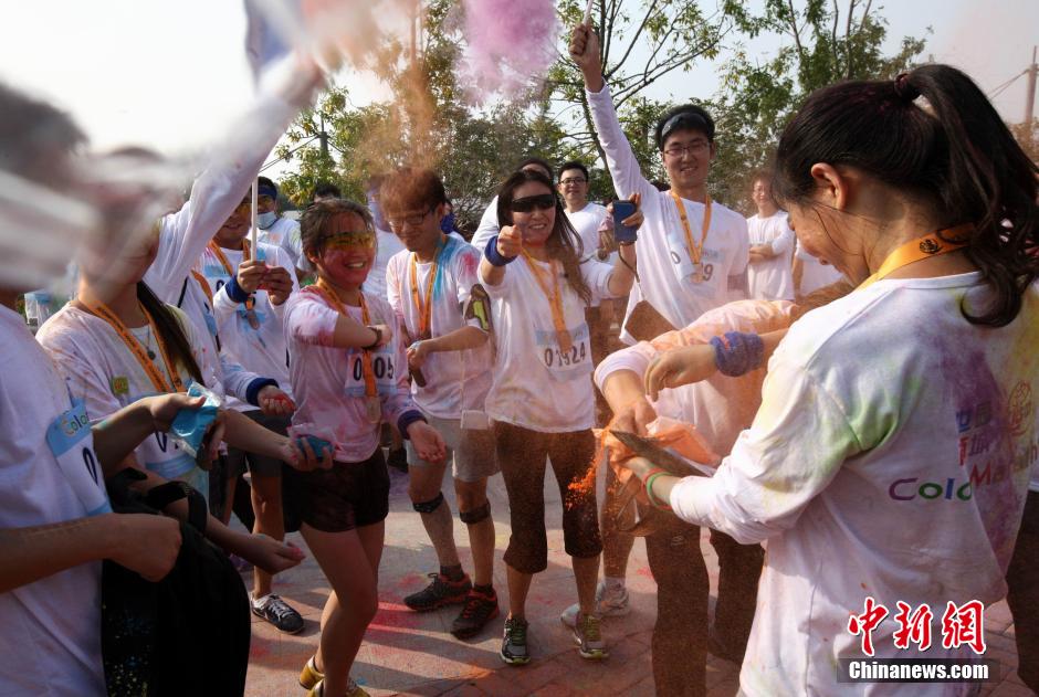 10月12日,“先天下color run环保健康彩跑活动”在石家庄一森林公园炫彩开跑,200多民众激情彩跑,并将彩粉相互抛洒在身上,把幸运带给每一个人。终点的色彩party点燃了每个人的激情,大家把彩粉抛向空中,把祝福传递下去。color run,源于印度节日,人们相互投掷颜料以求送去好运,后经美国人带到世界,形成将彩色粉末融入路跑的活动,被誉为世界上最欢乐的5公里跑。图为年轻人相互抛洒彩粉。中新社发 翟羽佳 摄