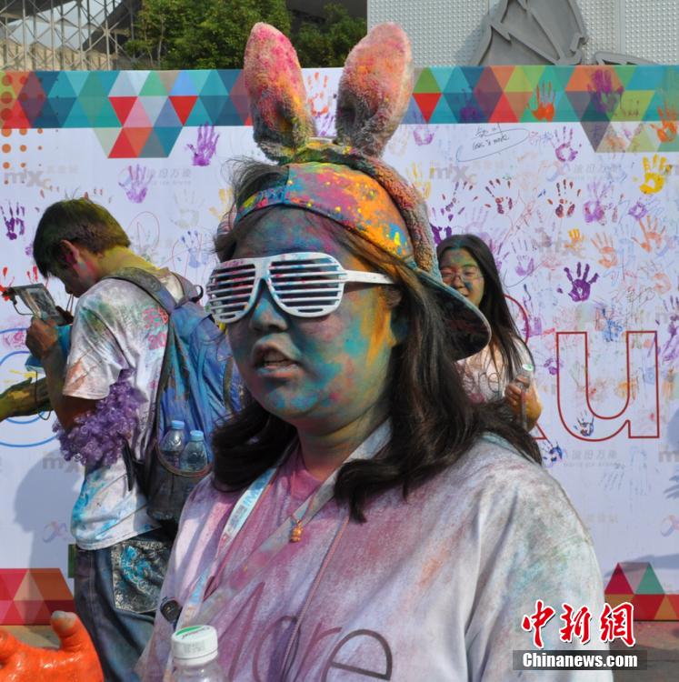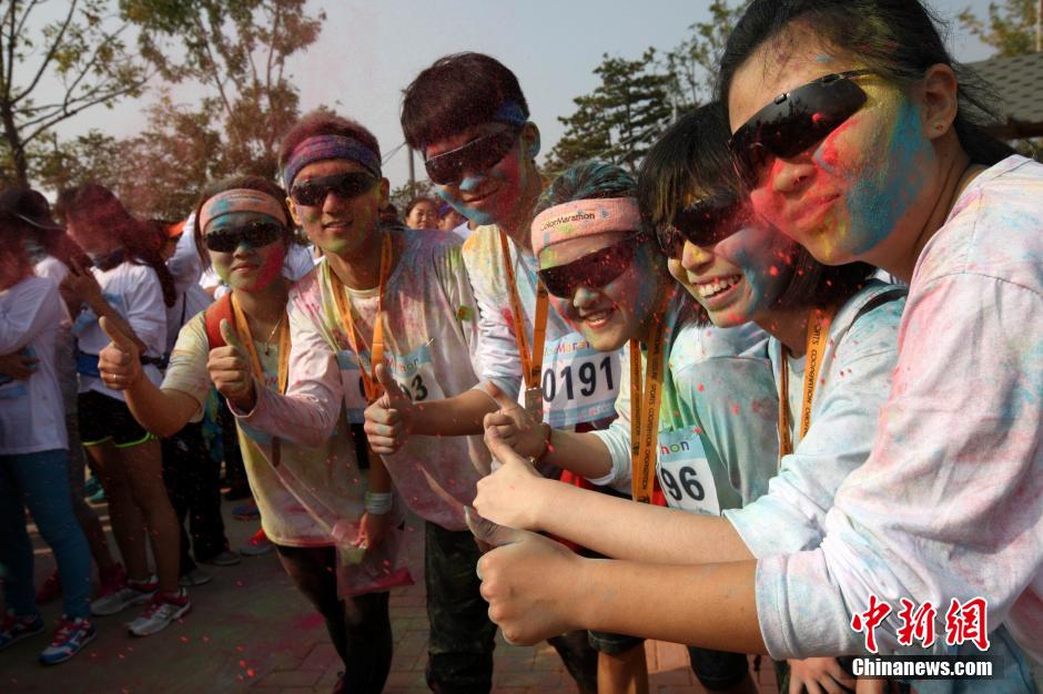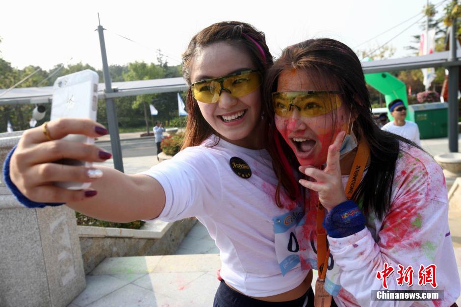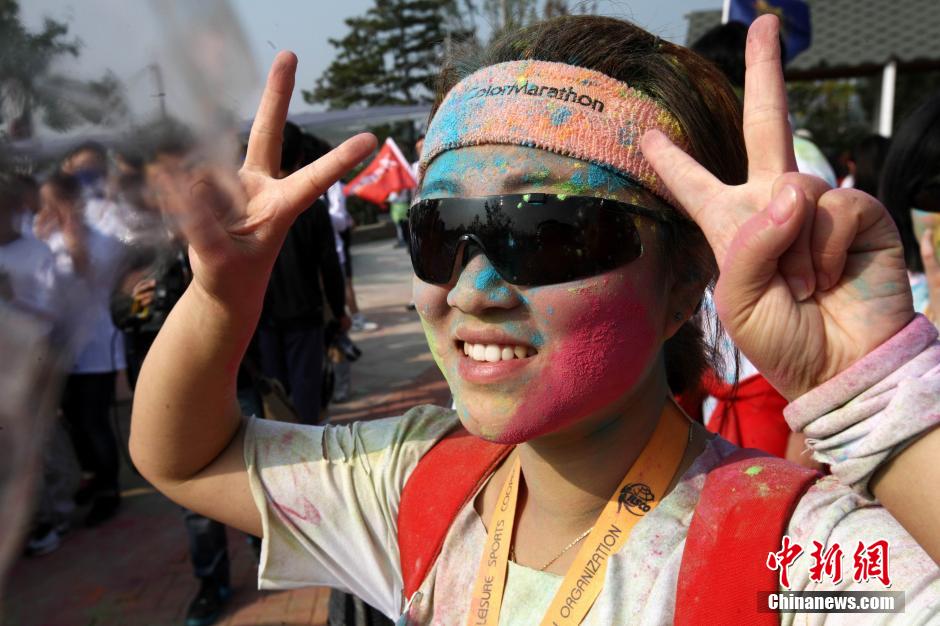 10月12日,“先天下color run环保健康彩跑活动”在石家庄一森林公园炫彩开跑,200多民众激情彩跑,并将彩粉相互抛洒在身上,把幸运带给每一个人。终点的色彩party点燃了每个人的激情,大家把彩粉抛向空中,把祝福传递下去。color run,源于印度节日,人们相互投掷颜料以求送去好运,后经美国人带到世界,形成将彩色粉末融入路跑的活动,被誉为世界上最欢乐的5公里跑。图为被染成五颜六色的的女孩们。中新社发 翟羽佳 摄