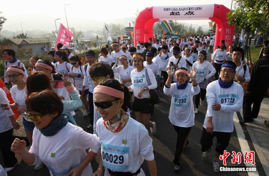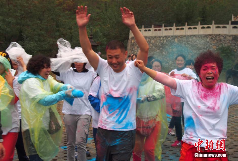 10月12日,“先天下color run环保健康彩跑活动”在石家庄一森林公园炫彩开跑,200多民众激情彩跑,并将彩粉相互抛洒在身上,把幸运带给每一个人。终点的色彩party点燃了每个人的激情,大家把彩粉抛向空中,把祝福传递下去。color run,源于印度节日,人们相互投掷颜料以求送去好运,后经美国人带到世界,形成将彩色粉末融入路跑的活动,被誉为世界上最欢乐的5公里跑。图为正在山间“彩跑”的欢乐市民。中新社发 翟羽佳 摄