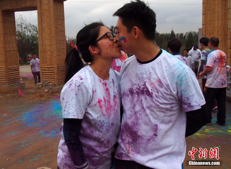 10月12日,“先天下color run环保健康彩跑活动”在石家庄一森林公园炫彩开跑,200多民众激情彩跑,并将彩粉相互抛洒在身上,把幸运带给每一个人。终点的色彩party点燃了每个人的激情,大家把彩粉抛向空中,把祝福传递下去。color run,源于印度节日,人们相互投掷颜料以求送去好运,后经美国人带到世界,形成将彩色粉末融入路跑的活动,被誉为世界上最欢乐的5公里跑。图为一对情侣到达终点后热吻。中新社发 翟羽佳 摄