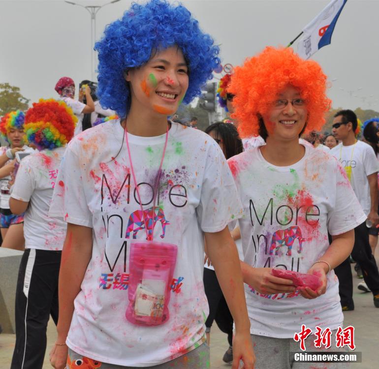 10月12日,2014无锡市网民公益体育大会之“万象炫跑”在无锡大剧院开跑,来自无锡及周边地区的2500多名网友通过报名集聚无锡,参与了全程5.6公里的“万象炫跑”,在跑完赛道后,众多网友还在无锡大剧院前广场就地进行彩色派对。据悉,与风靡全球的“彩色跑”一样,“万象炫跑”活动不计时,全程总共设置7个色彩站,参与者每经过一个色彩站,都会被播散一种颜色并传递多彩快乐。参与者通过互扔彩粉、创意作画等方式,加强人与人的情感互动。孙权 摄