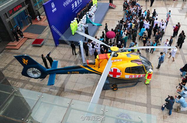 据军报记者微博报道,10月12日,一条成建制的空中医疗救援通道在位于西安市的第四军医大学西京医院正式启用。直升机医疗救援可在陕西省实现全域覆盖,据了解,直升机医疗救援为公益性医疗服务,只收取飞行成本费,若遇自然灾害、突发公共事件,将实施免费救援。图片来源:军报记者微博