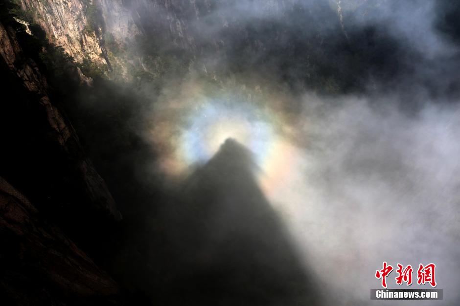 10月12日,安徽黄山风景区拍摄的 “佛光”奇观。据黄山志记载,“佛光”是一种特殊的自然物理现象,其本质是太阳自观赏者的身后,将人影投射到观赏者面前的云彩之上,云彩中的细小冰晶冰与水滴形成独特的圆圈形彩虹,人影正在其中。“佛光”的出现无原则要阳光、地形和云海等众多自然因素的结合,只有在极少数具备了以上条件的地方才可欣赏到。中新社发 施广德 摄 图片来源:CNSPHOTO