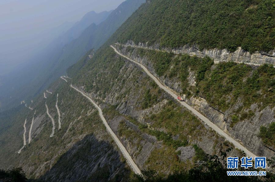 10月12日,一辆汽车行驶在湖北省恩施市新塘乡双木公路扯根坡段。位于湖北省恩施土家族苗族自治州恩施市新塘乡的双木公路(双河至木栗园),是一条全长约20公里的乡村公路,该公路经过名为扯根坡的大悬崖,长约4.4公里,非常险峻,犹如挂在悬崖上,被称为“壁挂”公路。新华社发(杨顺丕 摄)