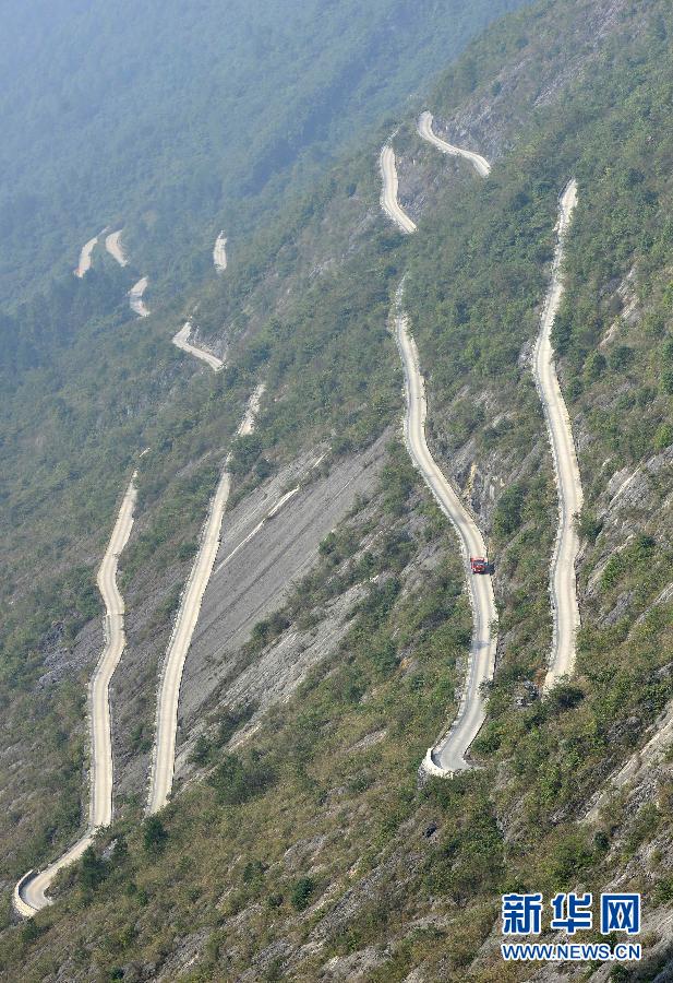 10月12日,一辆汽车行驶在湖北省恩施市新塘乡双木公路扯根坡段。位于湖北省恩施土家族苗族自治州恩施市新塘乡的双木公路(双河至木栗园),是一条全长约20公里的乡村公路,该公路经过名为扯根坡的大悬崖,长约4.4公里,非常险峻,犹如挂在悬崖上,被称为“壁挂”公路。新华社发(杨顺丕 摄)