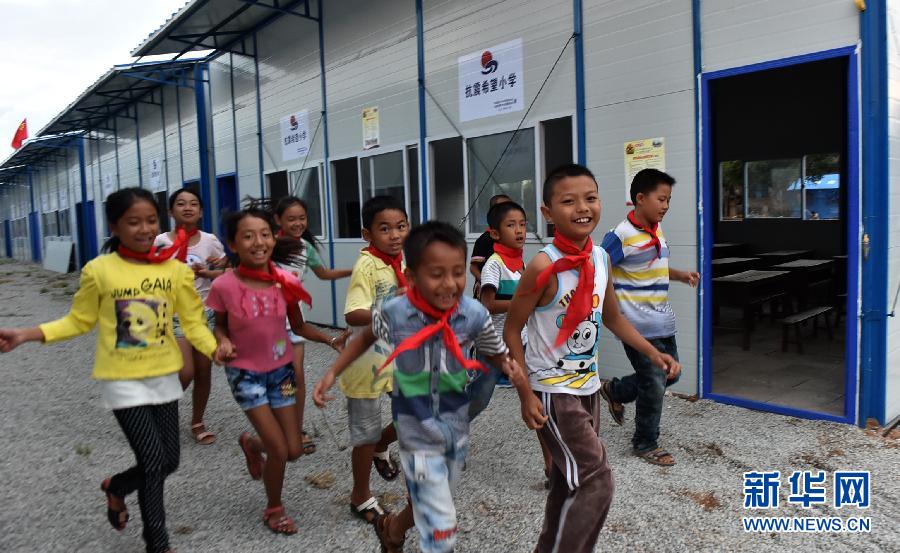10月12日,永平镇第一中心小学的学生在参观新建的板房学校。当日,由中国青少年发展基金会募集72万元为云南景谷地震灾区搭建的首所板房抗震希望小学在云南景谷县永平镇落成。该学校建成的首批24间板房教室,能满足永平镇第一中心小学一至四年级24个教学班1457名学生复课。新华社记者 陈海宁 摄
