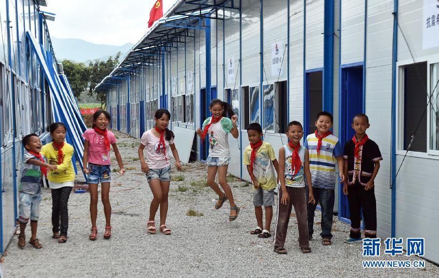 10月12日,永平镇第一中心小学的学生在参观新建的板房学校。当日,由中国青少年发展基金会募集72万元为云南景谷地震灾区搭建的首所板房抗震希望小学在云南景谷县永平镇落成。该学校建成的首批24间板房教室,能满足永平镇第一中心小学一至四年级24个教学班1457名学生复课。新华社记者 陈海宁 摄