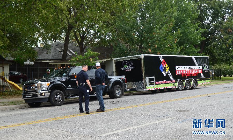 10月12日,在美国得克萨斯州达拉斯,应急车辆停在患者家门外。美国疾病控制和预防中心12日说,与美国本土发现的首名埃博拉患者有过接触的一名医务人员已被确诊感染埃博拉病毒。这是美国本土传染的第一个埃博拉感染病例,同时是美国本土检测到的第二个病例。新华社发(许迅摄)