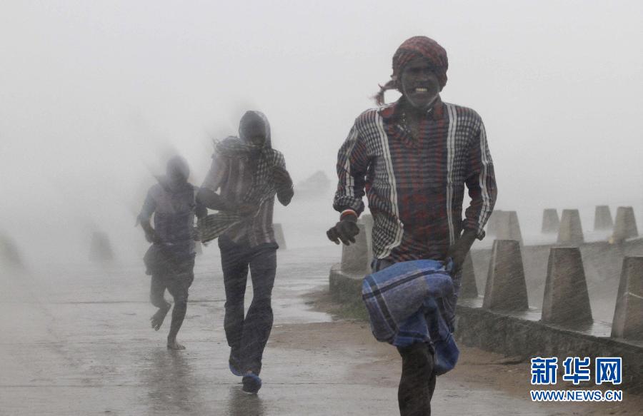 10月12日,在印度奥里萨邦戈巴尔布尔,人们在暴风雨中寻找藏身之地。印度官员12日说,当天上午强旋风“胡德胡德”在印度东南部沿海地区登陆,造成至少6人死亡。 新华社/美联