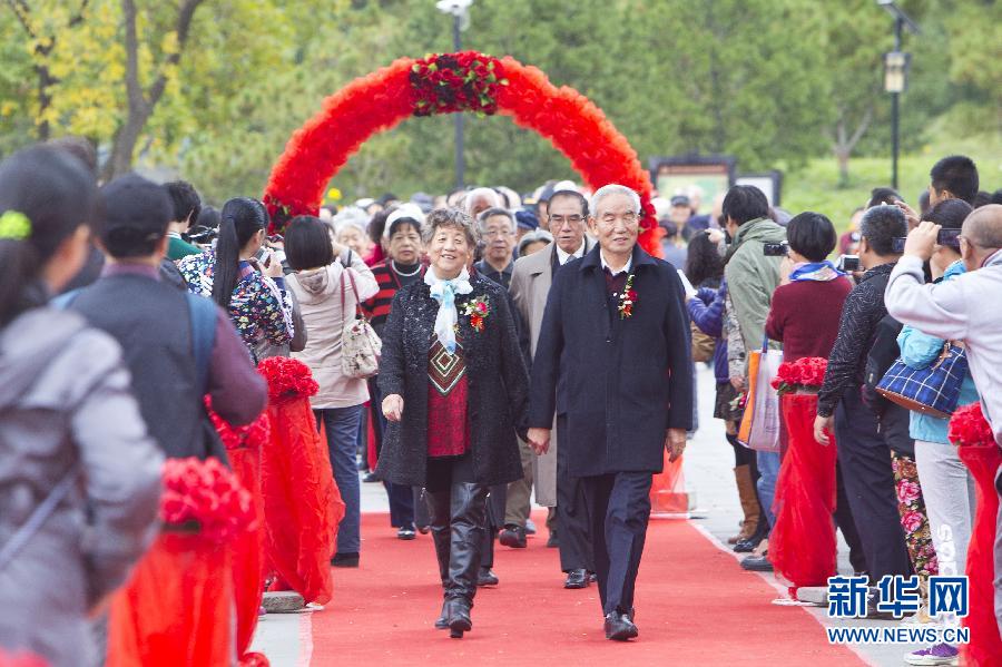 10月12日,在北京圆明园金婚庆典上,金婚夫妇携手走红毯。当日,“金彩五十年,秀在圆明园”第三届金婚庆典在北京圆明园举行,来自社会各界的百余对金婚夫妇参加活动,一起回顾和展示他们50年风雨同舟、患难与共的爱之历程。新华社发(赵冰 摄)