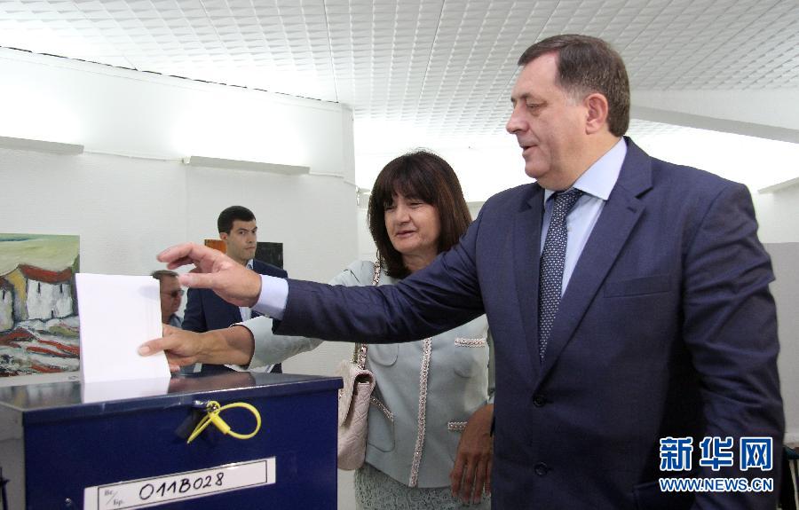 10月12日,在波黑塞族共和国首府巴尼亚卢卡,波黑塞族共和国总统多迪克(右)与妻子在一处投票站投票。波黑12日上午开始举行全国大选,选民投票选出波黑主席团(总统)3名成员和波黑各级议会议员。波黑大选每四年一次,上一次大选2010年举行。新华社发(鲍里斯拉夫·则林亚摄)