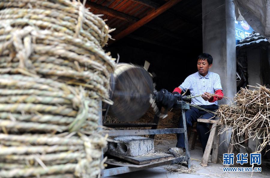 10月12日,在肥西县花岗镇蔡冲村,当地村民利用水稻秸秆加工草绳。目前正值水稻收割时节,安徽省肥西县花岗镇蔡冲村300多户村民忙着利用水稻秸秆加工草绳、草帘等稻草制品。据悉,近年来,蔡冲村通过成立合作社,鼓励村民将水稻秸秆变废为宝进行再加工。目前,该村生产的草绳、草帘等稻草制品销往全国各地,用于园林及包装行业。蔡冲村平均每户每年靠秸秆再加工可收益10万余元。新华社记者 刘军喜 摄