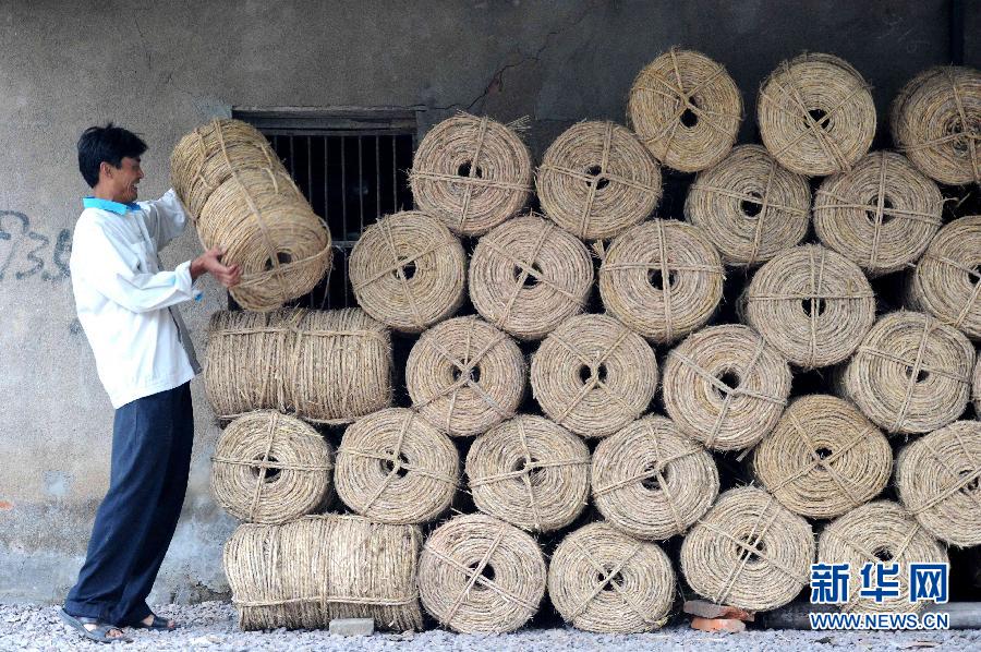 10月12日,在肥西县花岗镇蔡冲村,当地村民在堆放利用稻草加工的草绳制品。目前正值水稻收割时节,安徽省肥西县花岗镇蔡冲村300多户村民忙着利用水稻秸秆加工草绳、草帘等稻草制品。据悉,近年来,蔡冲村通过成立合作社,鼓励村民将水稻秸秆变废为宝进行再加工。目前,该村生产的草绳、草帘等稻草制品销往全国各地,用于园林及包装行业。蔡冲村平均每户每年靠秸秆再加工可收益10万余元。新华社记者 刘军喜 摄