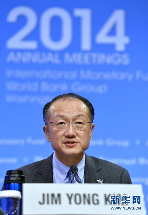 10月11日,在美国首都华盛顿,世界银行行长金墉在新闻发布会上回答记者提问。当日,世界银行和国际货币基金组织联合发展委员会部长级会议在华盛顿召开,会后金墉和拉加德共同召开了新闻发布会。 新华社记者殷博古摄