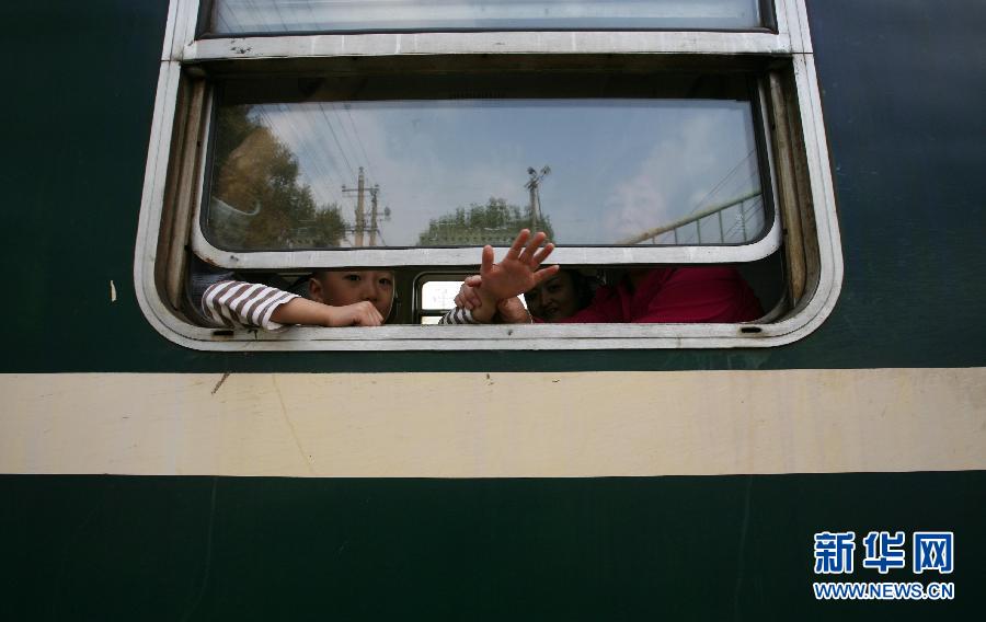 10月12日,在南京中华门火车站,7102次绿皮火车的小乘客向车外挥手。拥有78年历史的南京中华门火车站将于10月14日停止办理客运业务,届时,途经该站的旅客列车将不再停靠,售票处等和客运有关的业务也将同步停办,中华门火车站只办理货运业务。南京中华门火车站是中国著名的近现代铁路历史建筑,于1936年投入使用。 新华社发(王新 摄)