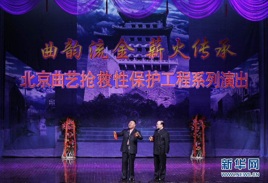 当日,“曲韵流金薪火传承”——北京曲艺抢救性保护工程系列演出继续在北京举行。为了更好地保护传统曲艺艺术,挽救濒危曲种,北京曲艺家协会于2013年起设立了北京曲艺抢救性保护工程,其中包括开办曲艺大课堂、开展老艺术家口述历史录制工作等,并于2014年9月13日、14日,10月11日、12日在北京举行曲艺艺术家经典节目展示。新华社记者高静摄