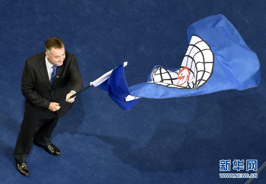 10月12日,女青年手举会旗跑步进场。当日,第45届体操世锦赛在广西体育中心体育馆闭幕。 新华社记者肖艺九摄