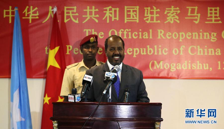 10月12日,在索马里首都摩加迪沙,索马里总统哈桑·谢赫·马哈茂德在复馆仪式上致辞。当天,中华人民共和国驻索马里联邦共和国大使馆复馆仪式在索马里首都摩加迪沙举行。1991年索马里陷入内战后,中国驻索马里大使馆撤离。2012年,索马里和平进程取得突破性进展,成立21年来首个正式政府和议会。为进一步推动中索友好合作关系发展,中国政府今年6月宣布决定恢复驻索马里使馆。新华社记者张晨摄