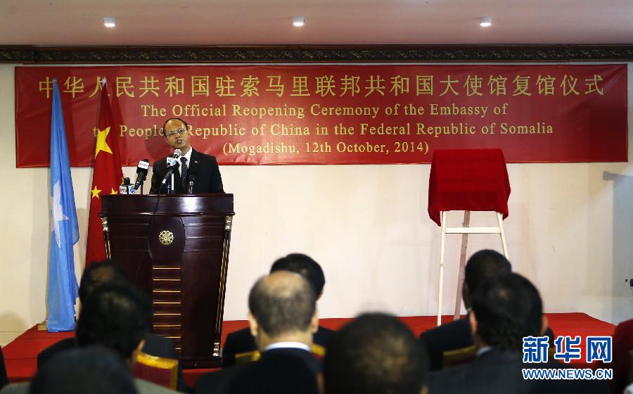 10月12日,在索马里首都摩加迪沙,中国新任驻索马里大使韦宏添主持复馆仪式。当天,中华人民共和国驻索马里联邦共和国大使馆复馆仪式在索马里首都摩加迪沙举行。1991年索马里陷入内战后,中国驻索马里大使馆撤离。2012年,索马里和平进程取得突破性进展,成立21年来首个正式政府和议会。为进一步推动中索友好合作关系发展,中国政府今年6月宣布决定恢复驻索马里使馆。新华社记者张晨摄