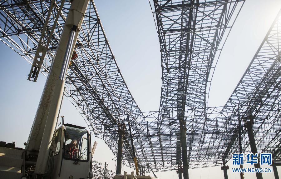 10月12日,吊车司机尚师傅在乌鲁木齐新客站内部进行吊装作业。乌鲁木齐新客站是兰新铁路第二双线的终点站,建成后将成为乌鲁木齐最大的火车客运站。目前,工程进展顺利,预计一期工程主体结构本月底完工,明年将进入全面的装修及设备安装调试工作,有望于2015年年底投入使用。新华社记者 江文耀 摄