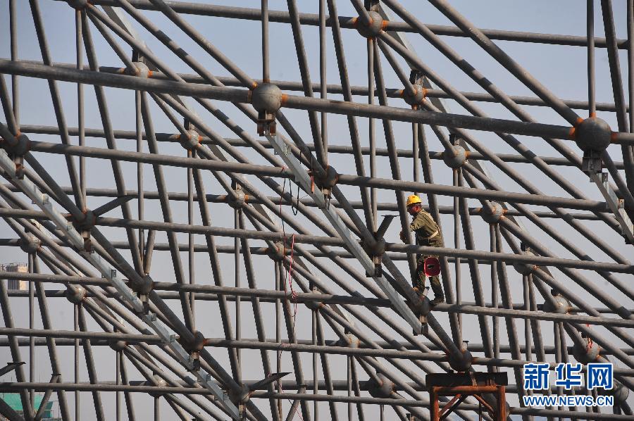 10月12日,一名工人在乌鲁木齐新客站内进行高空作业。乌鲁木齐新客站是兰新铁路第二双线的终点站,建成后将成为乌鲁木齐最大的火车客运站。目前,工程进展顺利,预计一期工程主体结构10月底完工,明年将进入全面的装修及设备安装调试工作,有望于2015年年底投入使用。新华社记者 江文耀 摄