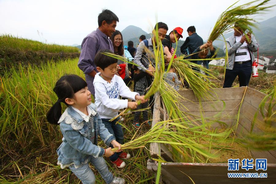 10月12日,在浙江省奉化市大堰镇,小朋友在农民指导下体验打稻谷。当日,浙江省宁波市宋诏桥幼儿园的小朋友在家长的带领下来到宁波大堰镇收获稻谷,体会种粮辛苦,培养节约粮食的好习惯。 新华社发(张培坚摄)