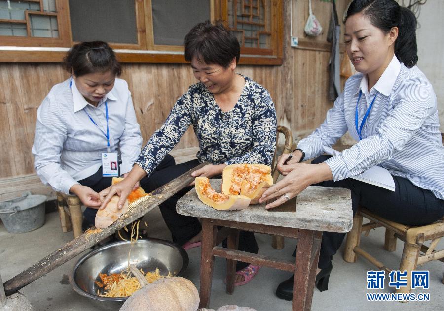 10月12日,浙江省景宁畲族自治县农村信用合作联社鹤溪信用社工作人员雷美芝(左一)、韦炳梅(右一)来到该县澄照乡金丘村,为低收入创业农户兰灵银(中)落实用于发展养殖业的5万元“政银保”小额贴息贷款。新华社发(李肃人 摄)