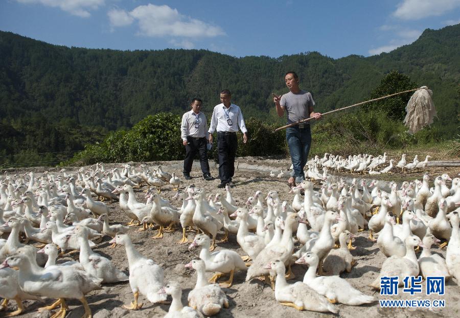 10月12日,中国邮政储蓄银行景宁畲族自治县支行工作人员刘晓林(中)、陈勇杰(左),来到该县标溪乡于章村第五村民小组董师兴(右)养鸭场,了解今年养殖情况。已经养了18年鸭的董师兴,一场禽流感让他成了新的低收入创业农户。2014年,在10万元“政银保”小额贴息贷款帮扶下,他的鸭场规模重新发展壮大,平均存栏数保持在5000只以上。新华社发(李肃人 摄)